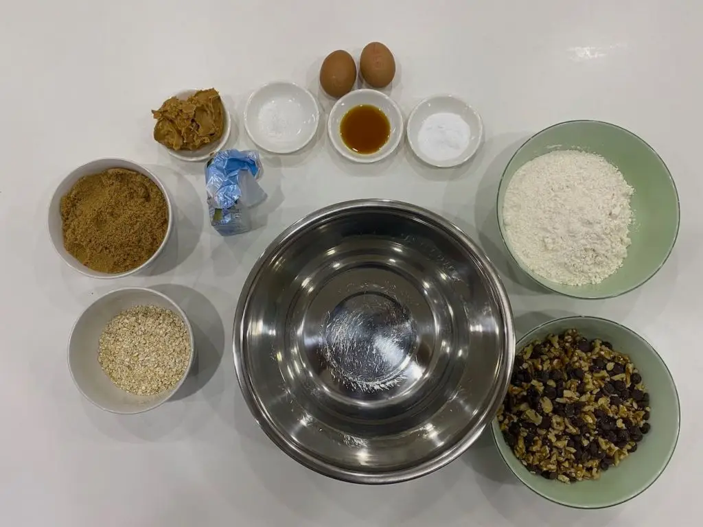 Now it’s time for the cookie recipe that’s been rolling around in my head for 20 odd years. This should take you about 15 mins to prepare and 10-15 minutes to cook each batch. If you’re not a fan of nuts or are deathly allergic to them, you can swap them out for other things. Or you can just wait for another non-nut cookie recipe when I get around to publishing it.
