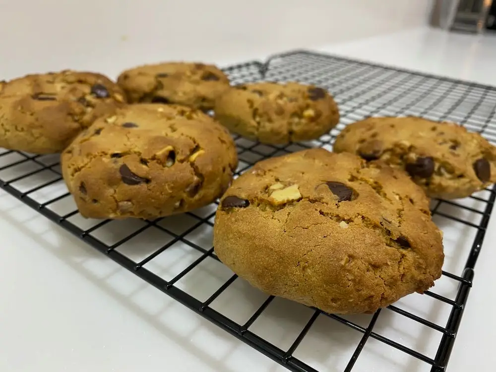 - Check your oven temperature. Even though I had it set to 175C my internal thermometer was closer to 200C, which I forgot to check. The second batch was done on a lower temp resulting in a lighter finish on the cookies.