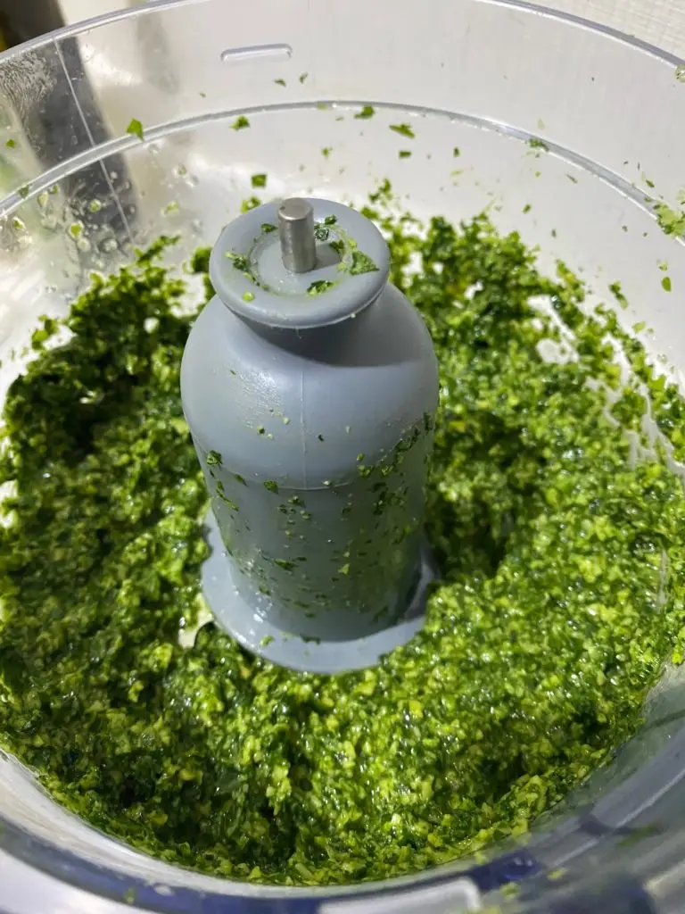 - Once everything is at a pesto like size, slowly add the olive oil until you get the consistency you require. 250ml was what it took to get my consistency.