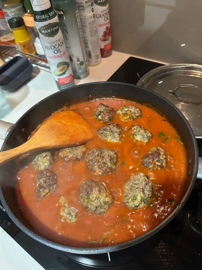 - Once the meatballs are cooked and browned, add them to the sauce and cover them. Let them cook for a further 5–7 minutes until coated nicely.
