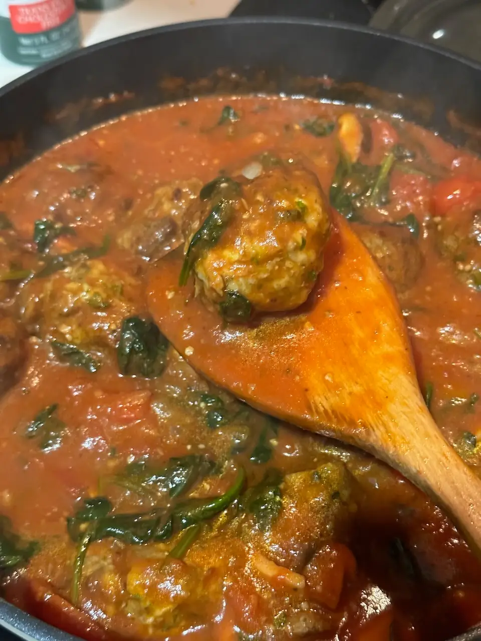 - Let the sauce reduce by about 10% and reduce it to a low simmer until the meatballs are ready.